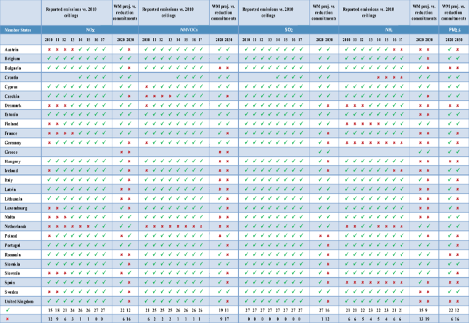 Conform datelor și proiecțiilor efectuate, România a îndeplinit reduceriile de emisii asumate inclusiv pentru primul semestru al anului 2020, cu excepția celei corespunzătoare oxizilor de de azot. Alte cinci state – Letonia, Lituania, Grecia, Polonia și Slovenia – au eșuat în atingerea acestui obiectiv, conform Agenției Europene de Mediu.