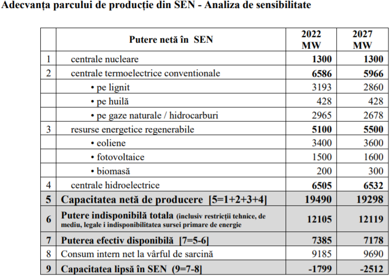 “Închiderea activității la centralele pe cărbune, corelat cu nerealizarea grupurilor noi preconizate, are impact negativ asupra adecvanței și securității energetice la nivel național și chiar regional, efect multiplicat în ipotezele unor condiții meteorologice severe (iarnă geroasă), caracterizate de o creștere a consumului intern net și de lipsa sursei primare pentru centralele electrice (lipsă vânt/apă) și eventuale probleme în rețeaua de transport gaze naturale, situație în care capacitatea lipsă la vârful de sarcină depășește capacitatea de import a RET și, astfel, SEN nu mai dispune de resursele necesare acoperirii consumului de energie electrică, cu utilizarea la maxim a capacității transfrontaliere de import”.