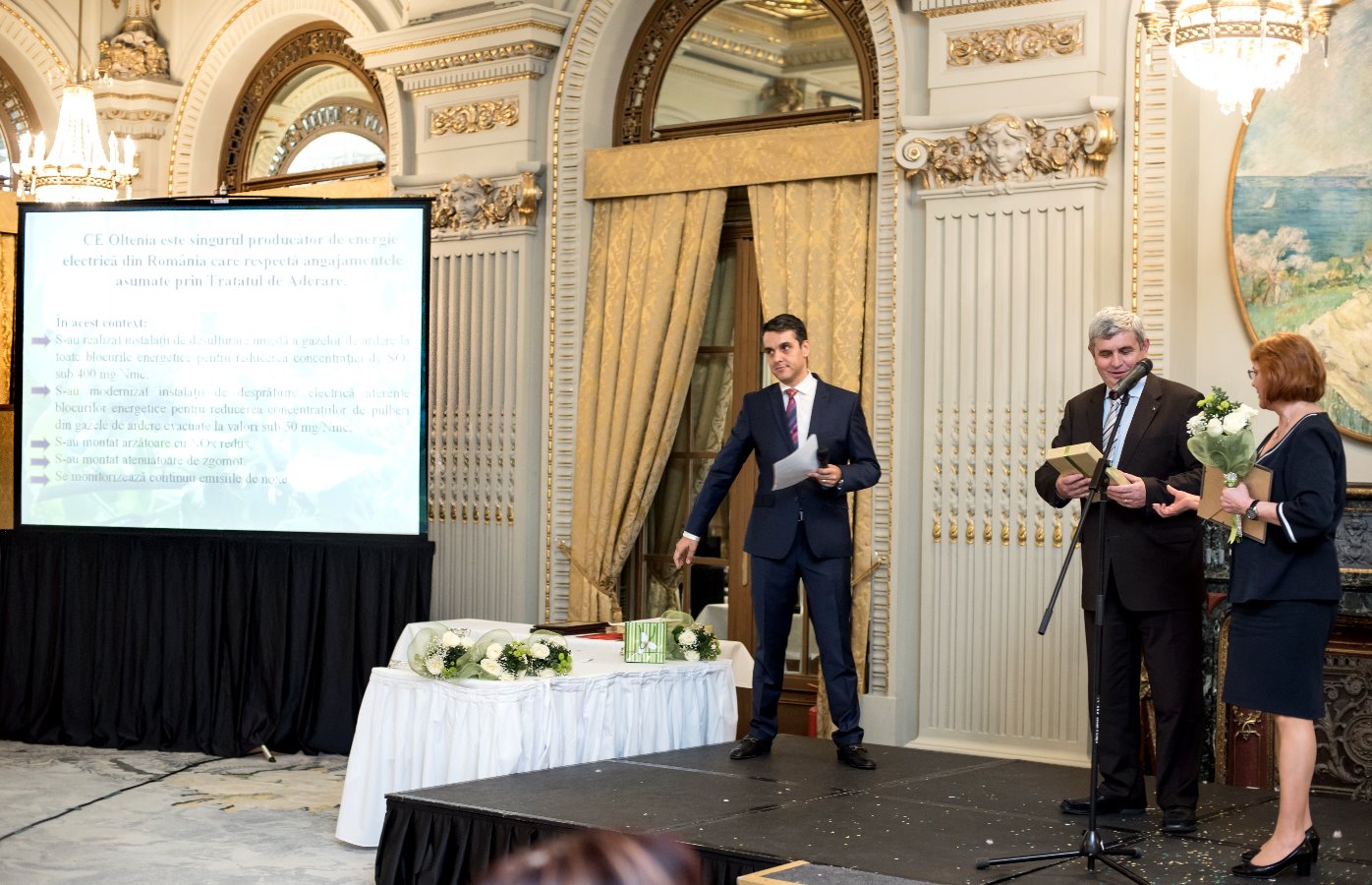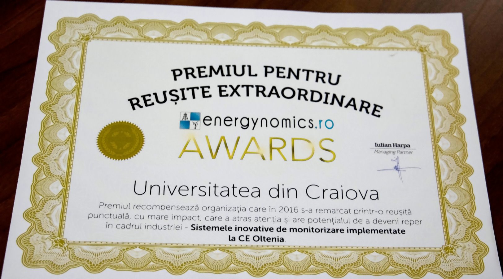 Acordarea diplomelor de merit persoanelor implicate in implementarea sistemelor de monitorizare si prelucrare a parametrilor electrici de excitatie la generatorul grupului energetic nr.5 de la SE Turceni – proiect realizat in colaborare cu Universitatea din Craiova si premiat cu medalia de aur in cadrul Salonului International de Inventii de la Generva, precum si in cadrul galei Energynomics Awards 2016.